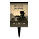 This wedding cake topper features a silhouette couple riding a motorcycle with a mountain sunset or sunrise background. Personalize with a name and date or any text that you wish to add.