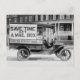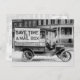 Vintage, black and white photo of a motorized mail wagon by the U.S. Post Office, parked in front of row apartments. A sign, "Save time, get a mail box," is attached to the side of the vehicle. The mailman is wearing a uniform with hat. Photo c1916 by Harris & Ewing/LOC