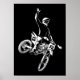 Pen & ink drawing of a motocross rider mid-jump, in bronco-buster clothes & pose. B/W, t-shirts, sweats, cards, prints, gifts.