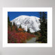 Accent a living space with this poster print featuring a scenic, landscape photo image of snow covered Mount Rainier and fiery, fall colors in subalpine meadows as viewed from a hiking trail in Mount Rainier National Park, Washington. Select your poster size and other options as desired.