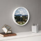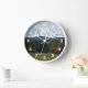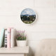 Decorate a living space with this stylish wall clock with white numerals and features a scenic landscape photo image of snow covered Mount Rainier and a green valley in the Pacific Northwest state of Washington. Select your clock style and size. Use to decorate a living room, dining room, kitchen, bedroom, or any other room.