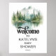 Gorgeous mountain themed baby shower sign with watercolor trees, mountains and water. Perfect for an outdoor adventure themed baby shower.