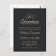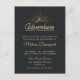 A birthday party invite postcard with a gold colored illustration on a black-gray background. Designed with an illustration of a mountain with the suns rays shining outward from behind. Typography says: Adventure explore dream discover.