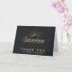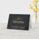 Thank you card with a gold colored illustration on a black-gray background. Designed with an illustration of a mountain with the suns rays shining outward from behind. Typography says: Adventure explore dream discover. Personalized message inside the card.