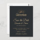 Wedding save the date postard with a gold colored illustration on a black-gray background. Designed with an illustration of a mountain with the suns rays shining outward from behind. Typography says: Adventure explore dream discover.