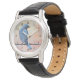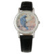 A bright mountain bluebird perches on a wire with a warm afternoon abstract sky in the background. The predominant colors in this image are blue and gray, contrasted with the orange and yellow of the sky. The artwork on this watch is from an original oil painting. All rights reserved.