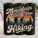 This retro-inspired graphic features the inviting phrase "Mountain Calling You Hiking" in bold, stylized typography. Silhouettes of two hikers with backpacks and poles are set against a vibrant striped sunset or sunrise. Flanked by pine trees, the design beautifully captures the allure of outdoor adventure, evoking a sense of peaceful exploration and nature's pull.