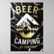 A graphic design illustration on a black marble background with a mountain landscape, tent, moon, and stars in a gold diamond frame that reads Beer and Camping Go Together.