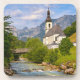 Plastic photo coaster with a landscape with a church next to a mountain stream with in the background Alps mountains on a summer day in Ramsau bei Berchtesgaden in Bavaria, Germany, next to the border with Austria.