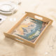 This is a well made, sturdy wooden tray with a flawless black finish and lovely map on the tray surface. It is both vintage & modern at the same time. Looks exactly like the photo; does not disappoint. So nice to find something of quality individually made and not the mass-produced 'shabby chic' merchandise seen in stores. I am so pleased to be able to give this to my college-age niece for her birthday. This can be used as a tray to hold jewelry or toiletries, or hung on the wall as art. The map surface is sealed (it is slightly shiny) so would be moisture resistant. It is well worth the asking price but I was able to apply a sale code as well. Very happy with my purchase. Map is crisp & clear and sealed with a water-resitant finish.