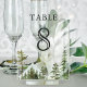 Elegant wedding table number featuring beautiful mountains and pine trees with modern typography.