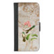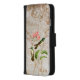 Monogrammed wallet case with two green, brown and white hummingbirds perch on the branch of a tropical plant with pink flowers, on an off-white vintage grunge background with gold swirls and floral silhouettes.