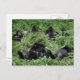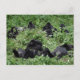 Postcard of a group of wild mountain gorillas with silverback and babies chilling in the green jungle of the Volcanoes national parc in Rwanda at the border with Congo and Uganda.