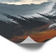 This poster design features a peaceful mountain landscape at sunrise. The large orange sun rises behind towering blue-gray mountains, casting a warm glow over the misty valley below. Dark evergreen trees line the foreground, with a calm river winding through the scene. The soft, muted colors give the poster a tranquil and calming feel, perfect for any nature lover's space.