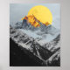 The poster design features a stunning mountain range with snow-capped peaks bathed in sunlight. A bold golden-yellow sun dominates the background, casting a dramatic glow over the mountains. The black-and-white contrast of the lower mountains and foreground adds depth, while the vibrant yellow creates a striking visual. This artwork is perfect for adding a modern, nature-inspired touch to any space.