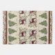"Mountain Lodge Christmas Tree Merry n Bright Deer kitchen towel." Blonde rustic wood background with striped layers of Christmas deer silhouettes with red and black buffalo check plaid, retro styled ornaments and forest Christmas trees with typography script text that is full of inspirational and emotional words. All art was created by internationally licensed artist and designer, Audrey Jeanne Roberts, copyright.