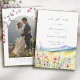 The back features a modern boho arch photo template framed by delicate wildflower accents, allowing you to showcase a favorite engagement picture with bohemian flair. This blend of scenic landscape art and personalized photography creates a stunning first impression for your guests. Whether you are marrying in a national park or a local garden, this nature-inspired card sets a romantic, organic tone for your upcoming wedding day.