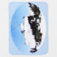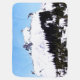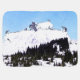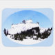 A painting of a snow covered mountain top that is the body for three young mountain goats. This winter mountainous scene features small groupings of pine trees, and a lovely blue sky. The painting is in an oval shape.