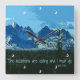 This unique wall clock features a vibrant photograph of majestic mountain peaks in Denali National Park, that's been digitally enhanced to look like a painting. The text reads 'The mountains are calling and I must go', a famous and popular quote by Naturalist John Muir. The clock numbers are represented by crescent moon shapes.