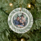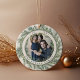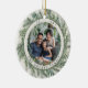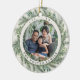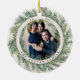 Elegant holiday photo ornament features a favorite photo on each side, framed by a wreath of lush green botanical pine foliage on a warm ivory background. Personalize with your family name and the year curved around the photo.