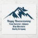 A cool mountain range real estate company champagne bottle label for a realty business located in a mountainous city or town. The realtor name is written in navy blue script under the house among mountains. Great marketing item for a mountaintop home builder.