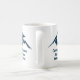 A cool mountain range real estate company mug for a realty business located in a mountainous city or town. The realtor name is written in navy blue script under the house among mountains. Great marketing gift for a mountaintop home builder.