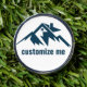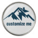 Mountain range real estate company golf divot tool for a realty business located in a mountainous city or town. The realtor name is written in navy blue script under the house among mountains. Great marketing item for a mountaintop home builder.