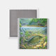 A cascade of shiny rainbow color reflects off the scales of a beautiful crappie river fish, swimming towards the mountains where a mama bear and her cub keep a keen eye out for their breakfast. Watercolor and gouache painting by Amanda Diehl