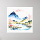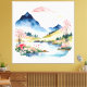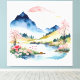 Watercolor scene of mountains and a river surrounded by trees and flowers of summer. Beautiful colors of blue and peach.