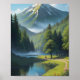 A serene landscape painting depicts a winding river flowing through a lush green valley, surrounded by towering mountains. The foreground features a single figure standing on a path beside the river, holding a staff. The mountains in the background are snow-capped and rise majestically against a clear blue sky.