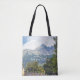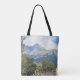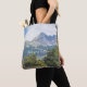 Tote Bag featuring a photo of majestic summer landscape. We see mountain peaks, blue sky and wooden cottages among trees. Great gift for nature, tourism, and hiking lovers. Please, personalize this Bag, adding your own message. For further modifications (font style, font color, text position) click "Edit design”.