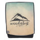 A backpack with an outdoorsy minimalist style. Designed with an illustration of a mountain with sunrays emanating from behind. The word wanderlust written below. Background is a parchment color with a hint of blue. A design that may appeal to outdoor types involved in backpacking. hiking, mountain climbing, and camping.