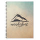 A spiral notebook with an outdoorsy minimalist style. Designed with an illustration of a mountain with sunrays emanating from behind. The word wanderlust written below. Background is a parchment color with a hint of blue.