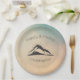 Personalized paper plates which also say "Happy Birthday" with an outdoorsy minimalist style. Designed with an illustration of a mountain with sunrays emanating from behind. Background is a parchment color with a hint of blue.