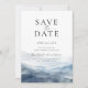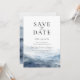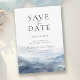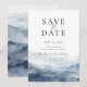 This wedding save the date card features a watercolor mountain landscape in dusty blue. Designed for mountain destination weddings, national park ceremonies, and rustic outdoor celebrations, the aesthetic focuses on a scenic and organic nature theme.