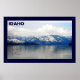 A digital painting of snow-capped mountains on the shores of Lake Pend Oreille (pond oray) at Sandpoint, Idaho on a late winter day. Text reading "IDAHO" also appears.
