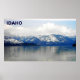 A digital painting of snow-capped mountains on the shores of Lake Pend Oreille (pond oray) at Sandpoint, Idaho on a late winter day. Text reading "IDAHO" also appears.