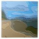 A bright, colourful abstract design of a mountain view, with blue sky, rock and trees.
