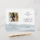 Misty mountains folded wedding program template with a photo area. Blue-gray mountain scenery covers the bottom third of the paper on all the pages. Customize text on front and back of 8.5 x 11 inch paper that will be folded in half after purchase. The photo of the couple will appear on the back page, with a personal message beneath. Full names of the bride and groom in script font on the front, held with a large ampersand. Also include location, date and time of wedding - or whatever you wish.