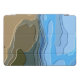A bright, colourful abstract design of a mountain view, with blue sky, rock and trees.