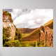 An art design of early autumn in the mountains. With brown hills, rocks and cloudy sky.