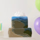 A bright, colourful abstract design of a mountain view, with blue sky, rock and trees.