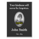 This minimalist funeral/memorial remembrance card features the message "Your kindness will never be forgotten.", and the personalized name and birth/death dates of the individual who has passed away. The message on the inside of the card can be personalized. It also features an area for a custom photo. It could be given to attendees at the remembrance ceremony of somebody who has recently passed away.