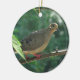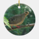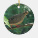 A pretty gray and tan turtle dove steps along a lichen covered branch in dappled summer sun.