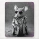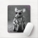 This photograph captures a whimsical scene of a tiny mouse, dressed in a stylish trench coat, and sporting a pair of Windsor framed glasses with purple lenses. The monochromatic tones of the black and white image, with a purple tinge to the border, add a vintage and timeless feel to it, while the steampunk style of the mouse's outfit adds an element of adventure and fantasy. The mouse's paw is casually tucked into the coat pocket, suggesting a cool and confident demeanor. Overall, the image invites the viewer to imagine a world where even the smallest creatures can have big personalities and adventures.
