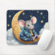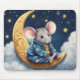 Cute mouse wearing pajamas on a gold crescent moon with stars and clouds