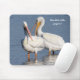 Mouse Pad with two funny White Pelicans. It looks like one of the Pelicans is asking the other for a date. Both are surrounded in blue water with white reflections.
