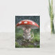 Cute mouse sitting under a polka dot toadstool in the rain.