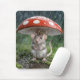 Cute mouse sitting under a polka dot toadstool in the rain.