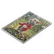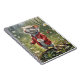 Cute mouse wearing a red jacket and holding a fluffy dandelion in a garden.